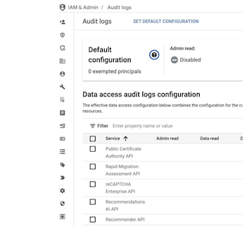 Cloud Audit Logs Configuration: These include logs for Admin Activity and Data Access. As you may have learned from our webinar or other sources, compromised credentials or misconfigured storage buckets (GCS) are major sources of compromise if not properly configured. You would immediately think one should capture and monitor those logs to gain visibility. You might also assume that this logging would be enabled by default, but it is not.